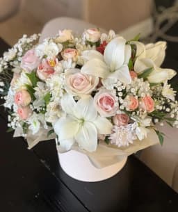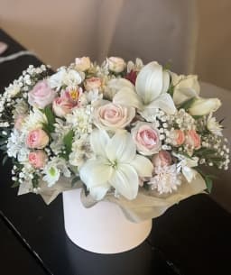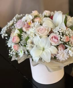 Шляпная коробка в нежных светлых оттенках, с ароматными цветами. Подарить и порадовать своих близких цветочной композицией просто так или по поводу дня рождения, юбилея, семейного торжества
